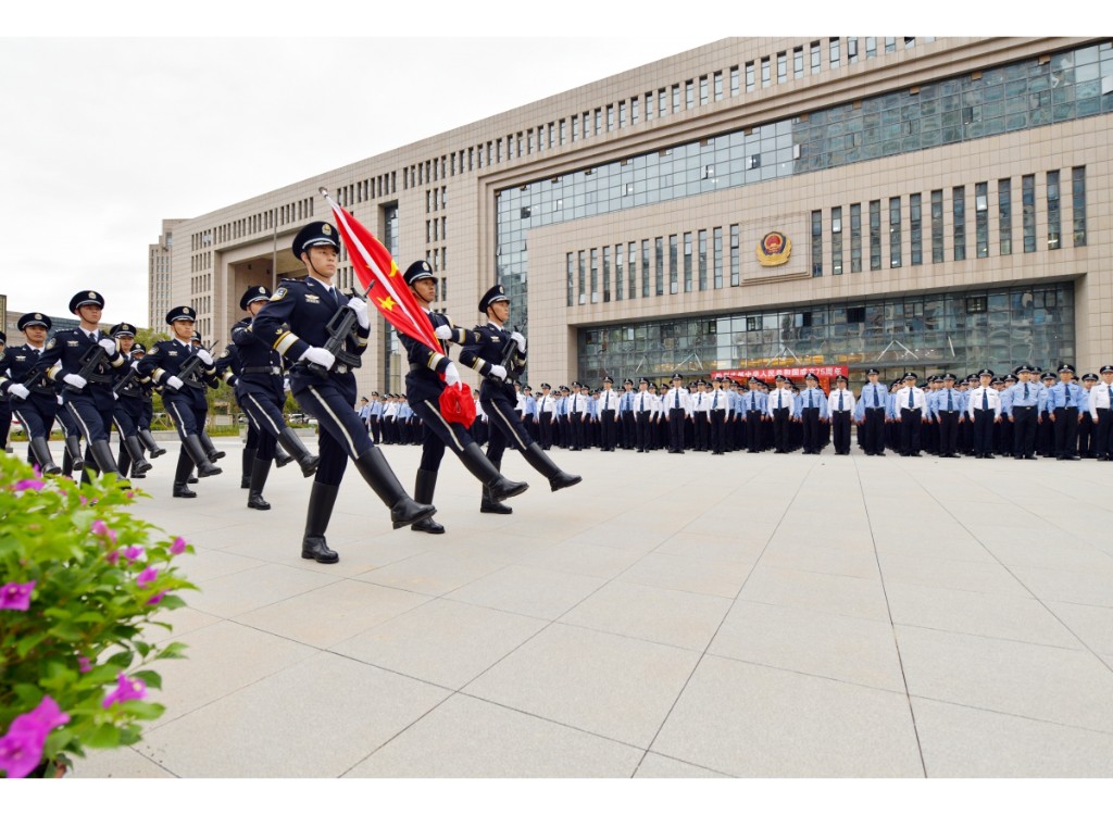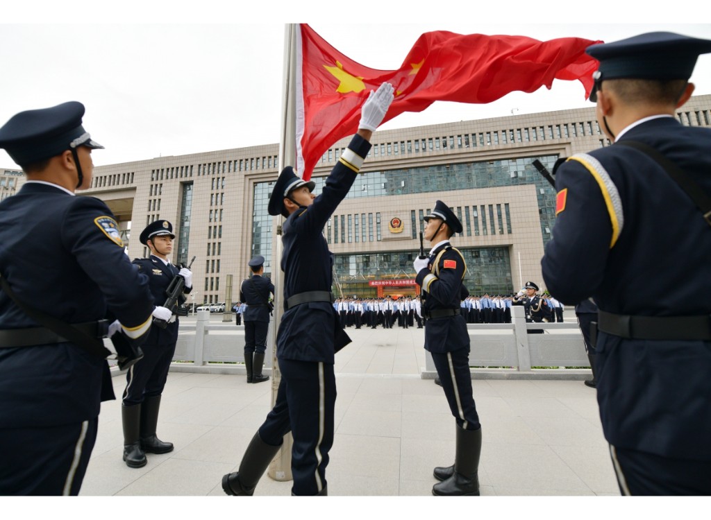 上午8时30分,升旗仪式正式开始。“迎国旗!”随着指挥员下达口令,由特警组成的护旗方阵,迈着铿锵有力的步伐,昂首走向升旗台。“升国旗、奏国歌。敬礼——”鲜艳的五星红旗伴随着雄壮的国歌冉冉升起,迎风飘扬。全体民警警容严整、精神饱满,向国旗庄严敬礼,表达对党和祖国的深切热爱和赤胆忠诚。
