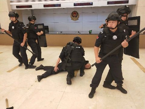 演练现场模拟了暴恐分子在公共场合持刀砍杀群众,特警队员接令迅速出动,巧妙利用防爆盾牌、抓捕叉、警棍等及时有效制服暴恐分子的警情,充分展示了特警队员应对处置暴恐袭击事件的技战配合和抓捕技术。