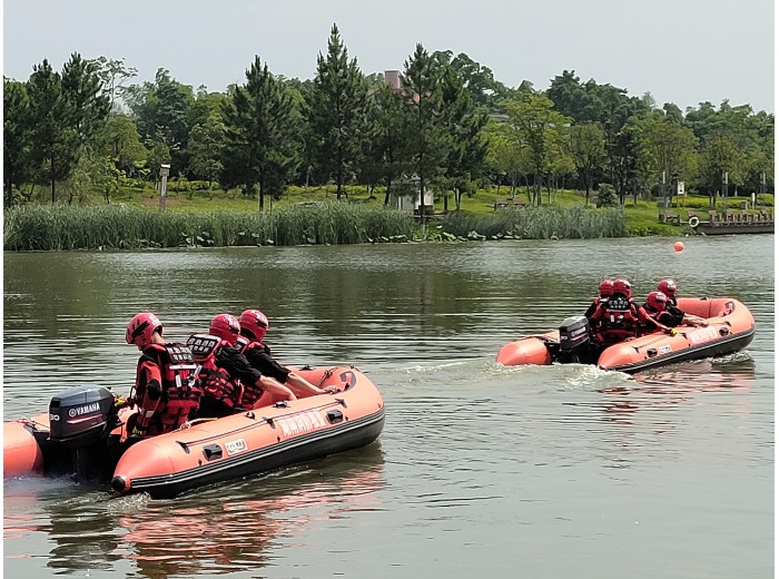 当天,特警支队与市消防救援支队还在万丰湖水域开展了水上突击救援联合训练。